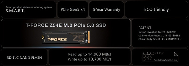 T-FORCE Z54E采用标准的M.2 2280,TLC闪存,容量1TB、2TB、4TB,顺序读写速度达到了14.9GB/s、14GB/s(1TB写入为13.7GB/s),已经吃满了PCIe 5.0 x4的理论带宽,不过随机指标未公开。